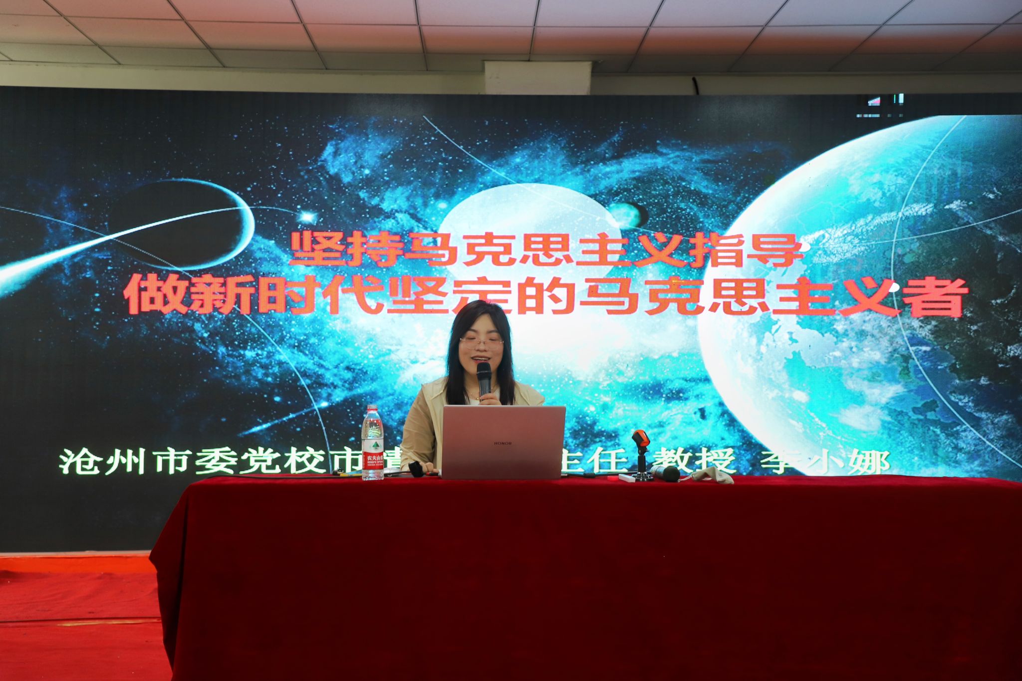为深入贯彻落实习近平总书记关于加强高校思政课建设的重要指示精神以及省、市委工作要求,进一步落实立德树人根本任务,6月6日下午,我校邀请沧州市校外辅导团特聘教授、中共沧州市委党校市情教研室主任李小娜讲授“坚持马克思主义指导,做新时代坚定的马克思主义者”专题讲座,200多名青年学生参加了讲座。李小娜从“深刻认识意识形态工作的极端重要性”、“精准把握意识形态的本质和特点”、“如何守好网络意识形态阵地”三个方面展开论述,...