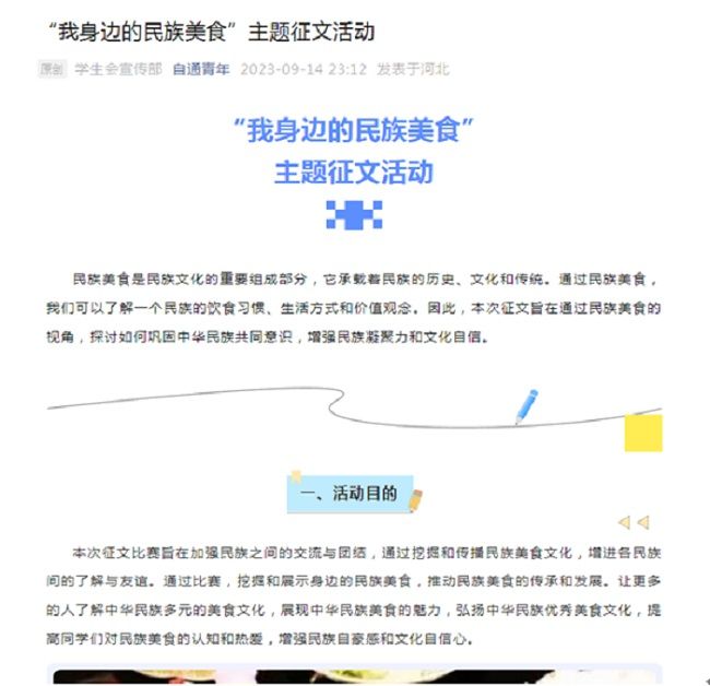 20239月是我省第14个民族团结进步宣传月,为全面贯彻落实习近平总书记关于加强和改进民族工作的重要思想以及视察河北重要讲话和重要指示批示精神,96日—28日,我校以铸牢中华民族共同体意识为主线,组织师生开展了丰富多彩的民族团结进步宣传月系列活动。