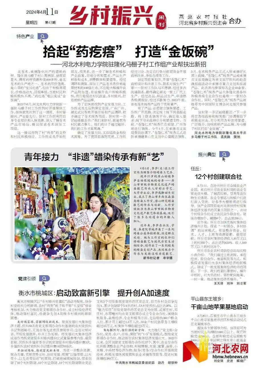 4月11日,《河北日报农村版·燕赵农村报》第5版以《拾起“药疙瘩” 打造“金饭碗”——九游官方网页版驻隆化马栅子村工作组产业帮扶出新招》为题,对我校驻村工作组产业帮扶事迹进行专题报道。