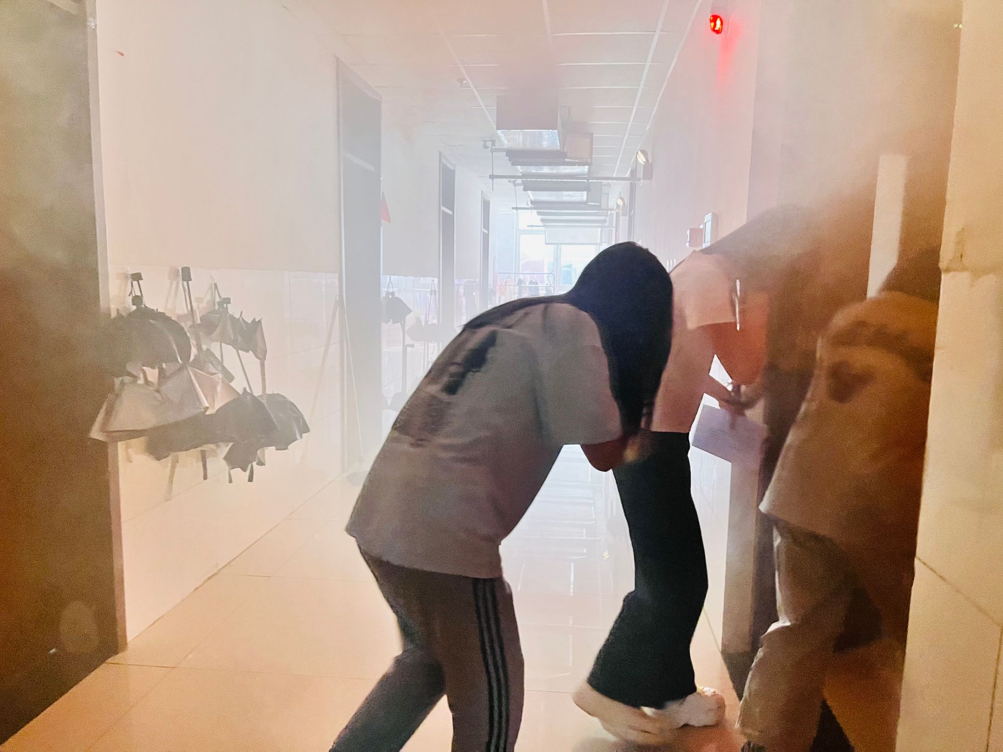 下午3点,总指挥张效松下达“演练开始”指令,三号学生公寓灭火和应急疏散演练正式开始。工作人员点燃烟雾弹,一名学生发现火情,立即拨打消防控制室电话,两名同学手提灭火器对发现的初起火灾进行了扑救,值班人员立即拉响警报,广播疏散指令指导疏散,并虚拟报火警。同时向学校安全工作处处长欧仁辉报告火情,消防控制室值班人员联系微型消防站消防员一同前往现场查看情况并灭火。欧仁辉向总指挥进行了火情汇报,随后,张效松宣布“立即启动应急预案”,综合协调组、灭火行动组、疏散引导组、安全警戒组、医疗救护组、后勤保障组和宣传工作组立即到达现场迅速处置。在各组的共同努力下,660名学生全部被顺利疏散到楼下,火灾也被迅速扑灭,各系清点好疏散人数后,学生处副处长路鹏向总指挥进行了汇报,总指挥宣布三号学生公寓灭火和应急疏散演练圆满结束。