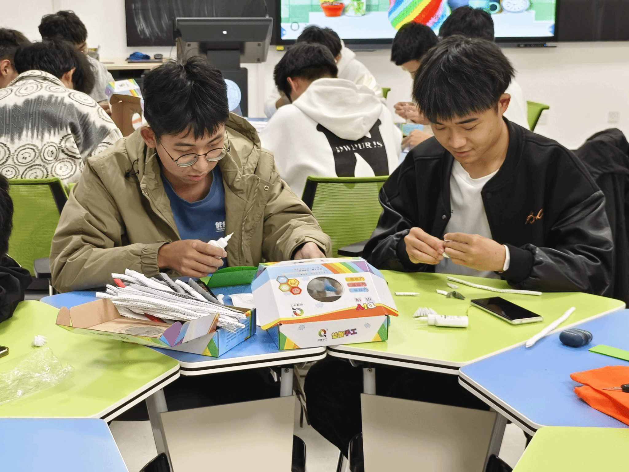 初赛环节中,同学们按照比赛设定,折叠规定数目的折纸,用时最短、效果最好的选手成功晋级决赛。一张张小小的纸片在同学们手指间翻转成一个个精巧的小三角。这不仅考验同学们折纸的速度,而且锻炼耐性,提高学生们的动手实践能力。到了决赛环节,同学们组建团队,折纸、拼接、搭建,每一个步骤都齐心协力、密切配合,在规定时间内高质量完成了一件件精美别致的纸雕作品。