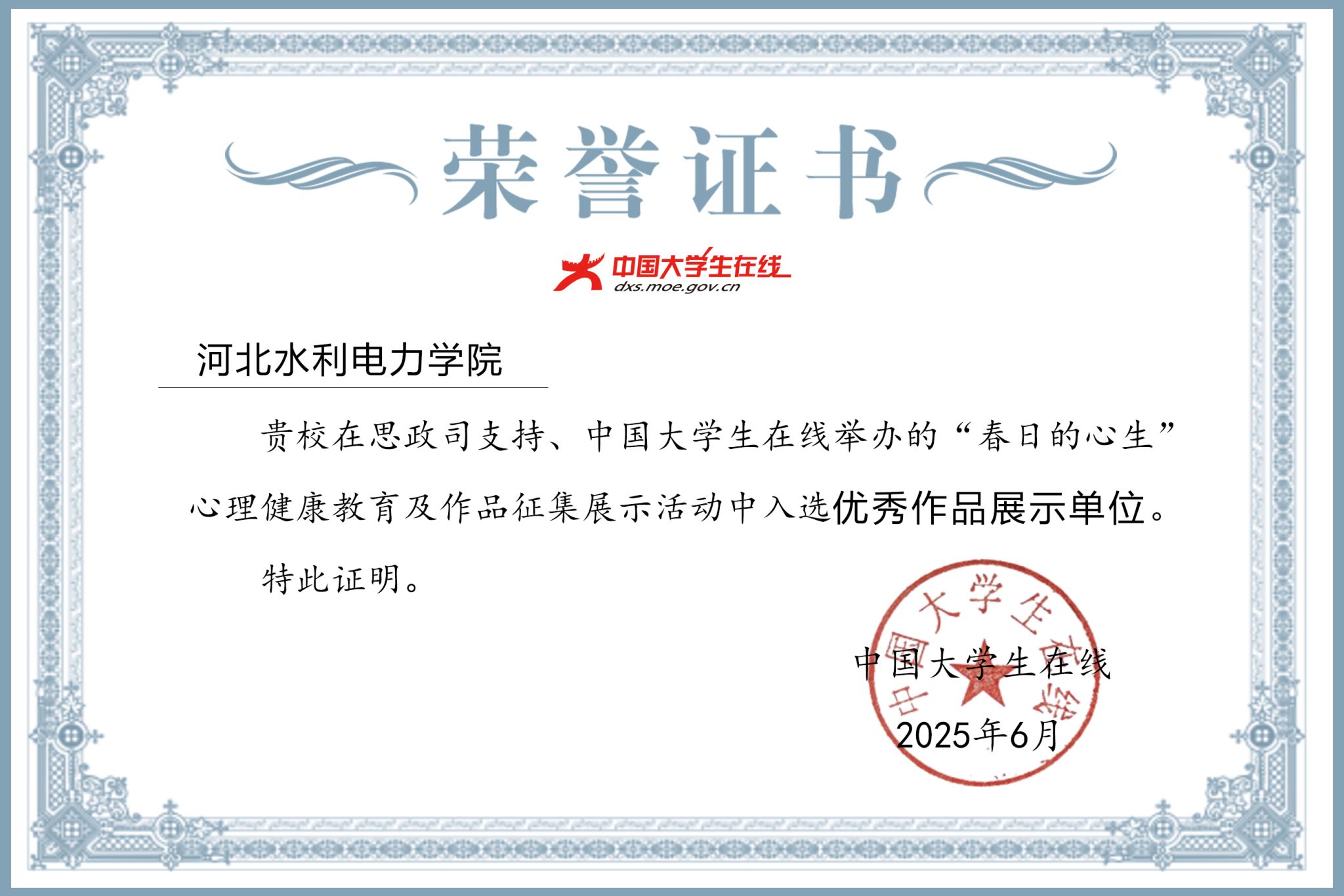 近日,由教育部思政司支持、中国大学生在线主办的“春日的心生”心理健康教育及作品征集展示活动圆满收官,活动共收到全国高校投稿2500余件,并评选出107所高校为“优秀作品展示单位”。我校积极响应号召,在活动组织工作中表现突出,凭借扎实的工作成效与创新实践,成功入选“优秀作品展示单位”。